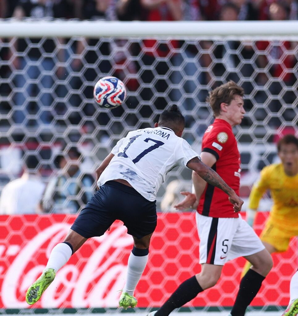 Corona se hizo presente en el marcador con un golazo al 38’, al recibir el balón a media cancha, condujo la pelota unos veinte metros, se acomodó y de derecha sacó un potente disparo a unos 25 metros de distancia que se incrustó a media altura a la derecha de la estirada del portero Nishikawa.